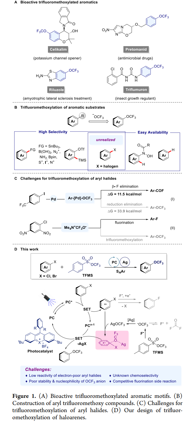 三氟甲氧基(OCF₃)因其独特的立体正交性、高电负性和优异亲脂性,广泛存在于Pretomanid、Triflumuron等药物及农药中。然而OCF₃阴离子热稳定性差、亲核性弱,直接对芳基卤化物进行三氟甲氧基化一直是合成难题。传统策略需预置Sn、B、N₂⁺等官能团,或虽使用C-H底物但位点选择性受限。使用廉价易得的芳基卤作为底物的直接三氟甲氧基化反应存在诸多挑战,即便过渡金属催化也难以实现,例如钯催化路线通常受β-F消除与竞争氟化困扰。因此,开发条件温和、选择性高、对电子中性及缺电芳基卤兼容的通用方法,对药物后期修饰和功能材料构建具有重要意义。