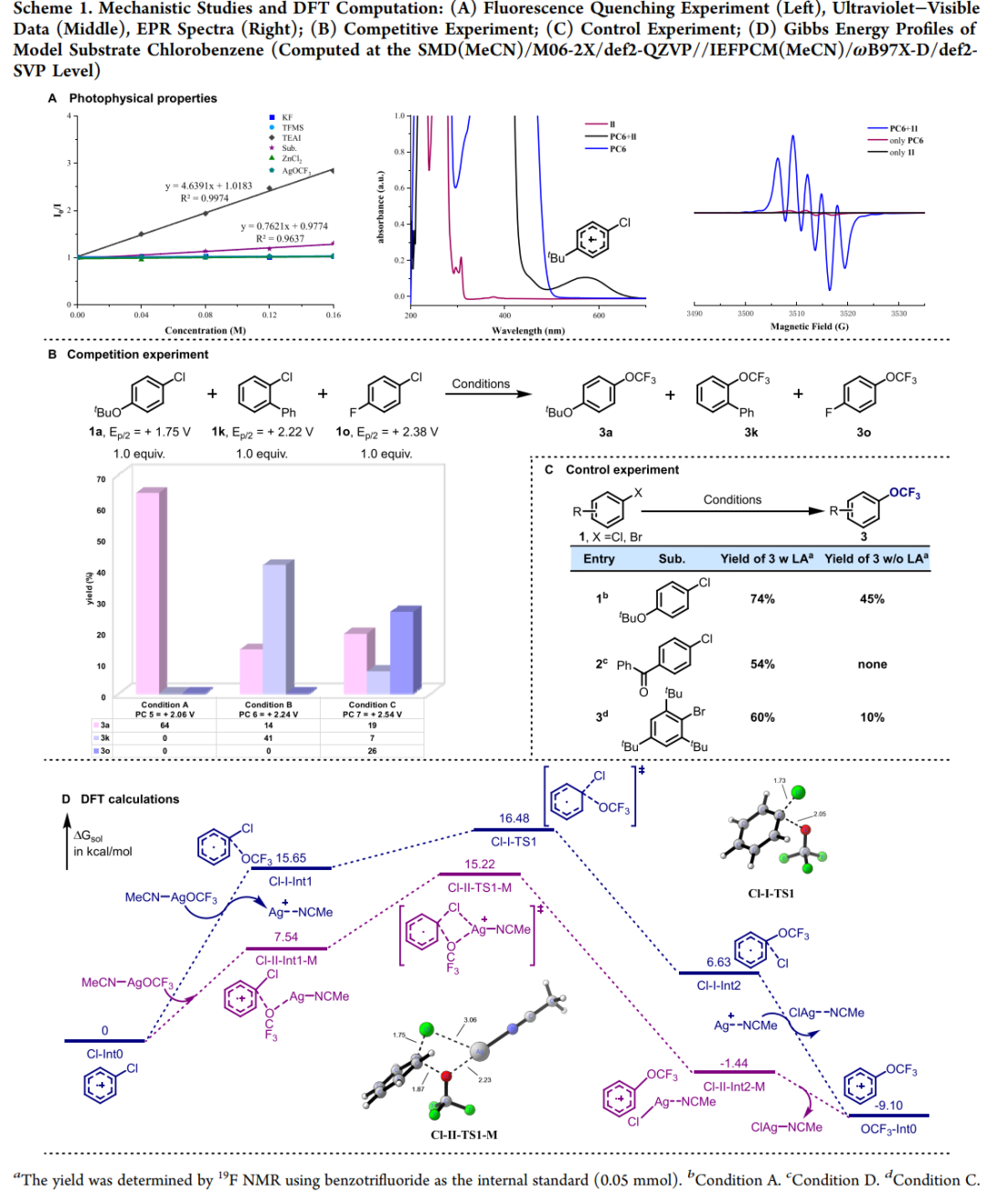 光开关实验与量子效率测定排除链式自由基路径;荧光淬灭、UV-vis及EPR证实PC*与芳卤发生SET生成芳基阳离子自由基;竞争实验显示只有氧化电位匹配的光敏剂才能转化对应底物;Lewis酸(ZnCl₂、AlCl₃、CoF₃)对惰性底物促进更显著,DFT计算表明Ag⁺同时与Cl⁻及OCF₃成桥,过渡态能垒由16.5降至14.8 kcal mol⁻¹,加速卤素离去并抑制产物回电子转移,从而抑制副反应。
