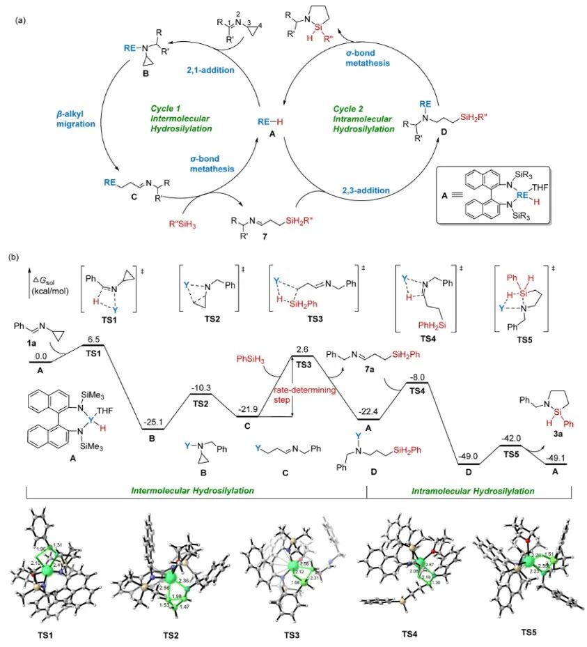 研究人员通过综合运用氘代标记实验、动力学同位素效应研究以及关键活性氢化物中间体(Y-H)的分离与单晶确认,清晰地揭示了催化循环的全过程。结合理论研究证实,反应由稀土氢活性物种启动,经历一个独特的 “2,1-加成 → β-烷基迁移/环丙烷开环 → 分子内环化” 串联机制。其中,β-烷基迁移是实现选择性环化的关键步骤。