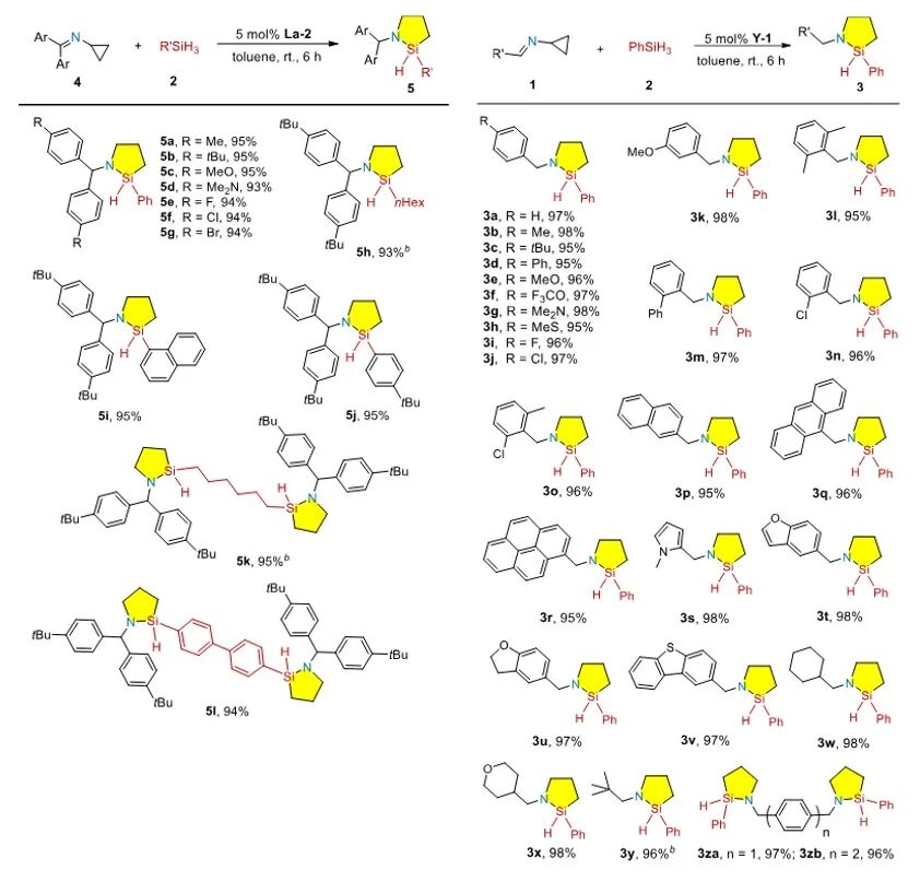 该团队在以往工作的基础上,首先研究了烯基-二胺稀土配合物催化的亚胺基环丙烷的硅氢化反应,发现其可以催化构筑硅氮杂五元环,但同时也会产生副产物。通过对配体的调控,他们发现联萘二胺稀土催化剂可以实现高选择性的成环反应。通过对反应条件、金属离子等的调控,发现钇和镧催化剂对成环反应显示优异的催化活性和选择性。在优化条件下,该催化体系展现出优异的底物普适性与官能团兼容性。对于单取代与双取代的亚胺基环丙烷,无论其芳环上连接的是给电子基团、吸电子基团,或是稠环、杂环体系,反应均能良好兼容,并以优异的产率获得目标硅氮杂环。特别值得一提的是,该策略同样适用于烷基取代底物,以及双亚胺基环丙烷,为构建结构复杂的双环体系提供了可能。