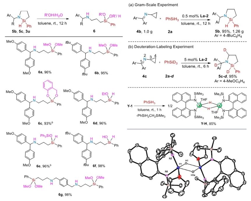 综上所述,本研究实现了联萘二胺稀土烷基配合物催化的亚胺基环丙烷的高效、高选择性的硅氢化反应。反应以优异的收率和选择性,合成了多种硅氮杂环化合物。生成的氮硅杂环戊烷可通过开环反应合成胺基官能团的硅氧烷与硅醇。本研究表明,稀土有机配合物在官能化张力环体系的催化硅氢化反应中具有巨大潜力。目前,关于稀土催化剂在新型催化氢元素化反应中的进一步应用研究正在进行中。