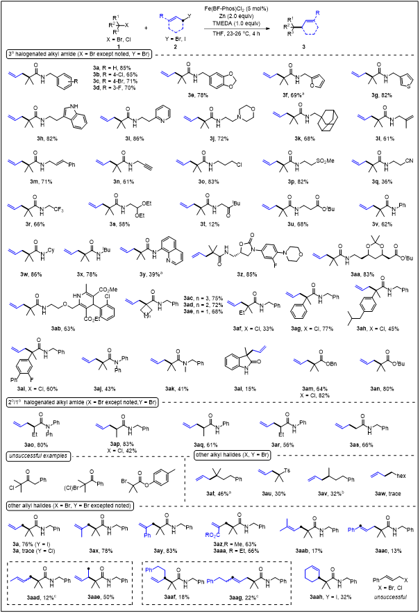 图2. 铁催化3º C(sp3)-1º/2º C(sp3)还原交叉偶联反应底物范围