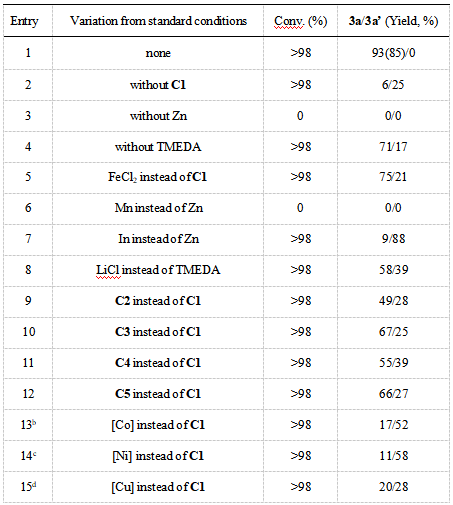 表1. 铁催化C-C还原偶联反应条件优化