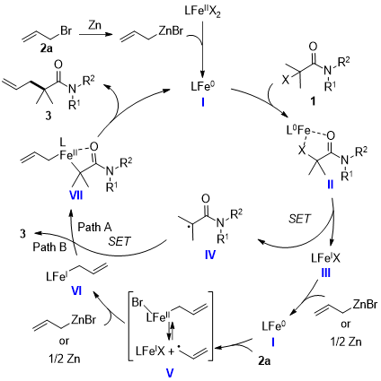 基于实验结果与文献报道,作者提出了可能的反应机理(图5)。反应初始阶段,烯丙基溴与锌反应生成烯丙基锌试剂,LFeII被锌试剂还原为中间体I,该中间体与底物1中的羰基配位形成中间体II。通过单电子转移(SET)过程生成中间体III与烷基自由基中间体IV。中间体III经烯丙基锌试剂或锌还原回I,I与底物2a发生SET生成中间体V,该中间体被烯丙基锌试剂或锌还原为VI,VI与IV经SET形成中间体VII,最终通过还原消除生成产物并再生I,完成催化循环(路径A)。除此之外,中间体IV也可直接与VI通过自由基取代反应生成产物(路径B)。考虑到体系内锌试剂浓度较高,其与底物的直接偶联路径亦不能完全排除。此外,含羰基底物的高反应活性暗示羰基可能作为导向基团,增强了反应效率。