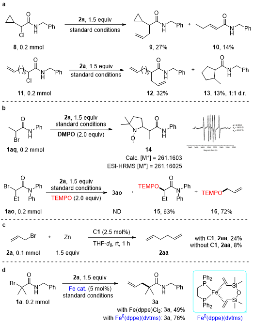 在机理探究中,自由基钟实验(图4a)与自由基捕获实验(图4b)均证实了烷基自由基中间体的生成。其中,DMPO捕获该自由基所得的加合物,随后通过EPR与HRMS分析得到了进一步验证。在锌粉与铁催化剂共存时,烯丙基溴2a的自偶联副产物显著增加,这支持了铁催化剂可能被原位还原为低价铁物种以驱动反应的推断(图4c)。当使用零价铁作为催化剂时,反应能以76%的收率顺利发生,这一结果表明反应很可能由零价铁物种诱导启动(图4d)。