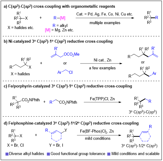 构筑季碳中心一直是有机合成领域的重要研究方向,但由于显著的空间位阻及多种竞争性副反应的存在,该方向始终面临较大挑战。过渡金属催化的C–C偶联反应是构建季碳中心的一种直接策略。目前,基于三级C(sp³)位点的过渡金属催化偶联反应已得到广泛研究,其中与C(sp²)物种的偶联报道较多,而与C(sp³)物种的偶联研究则相对有限,且大多依赖于对空气和水敏感、官能团兼容性较差的金属试剂(如格氏试剂、锌试剂等)(图1a)。过渡金属催化的还原偶联反应无需直接使用敏感的有机金属试剂,因而被认为是构建季碳中心更为理想的途径。目前,已有报道显示镍催化剂可实现三级烷基卤代物与烯丙基酯或苄基氯之间的还原偶联(图1b)。近期,铁催化剂也被成功应用于两种活性酯之间的还原交叉偶联反应(图1c)。然而,除此之外,相关成功案例仍较为有限。因此,开发新型催化体系,突破还原偶联在构筑季碳中心中的现有局限,具有重要的研究意义。