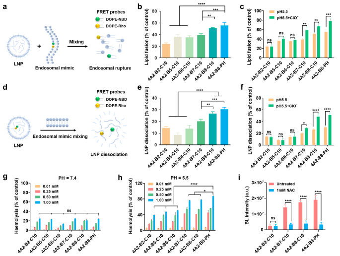 图3:利用FRET和溶血实验证明硫缩酮连接基显著增强LNPs的内体逃逸与膜融合能力,促进mRNA在肿瘤细胞中的释放。