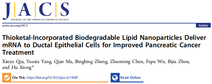 X. Qiu, Y. Yang, Q. Ma, et. al., Thioketal-Incorporated Biodegradable Lipid Nanoparticles Deliver mRNA to Ductal Epithelial Cells for Improved Pancreatic Cancer Treatment, J. Am. Chem. Soc., 2025. https://doi.org/10.1021/jacs.5c19387
