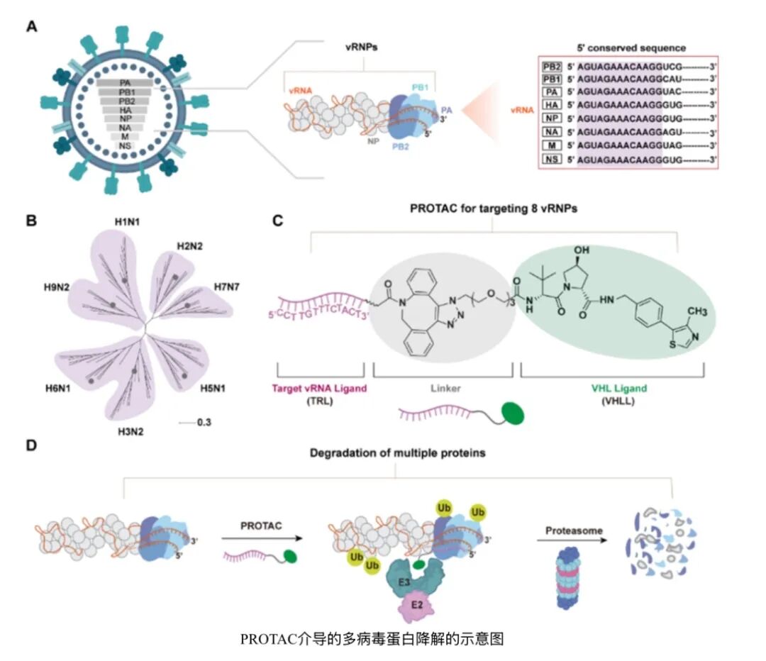该策略的核心在于巧妙地利用了病毒RNA中一段高度保守的“通用密码”——5'非翻译区(UTR)。这段序列在不同流感病毒株中极为稳定,是病毒复制不可或缺的“开关”。研究团队据此理性设计了一种多功能PROTAC分子,它像一位精准的“特洛伊木马”,能够同时执行识别、结合并引导降解的任务。其一端是能精准结合病毒“通用密码”的寡核苷酸配体,另一端则负责招募细胞内固有的蛋白质“粉碎机”(蛋白酶体),通过优化的连接子将二者紧密相连。当PROTAC分子进入被感染的细胞后,能同时钩住病毒的vRNP复合体和细胞的“粉碎机”,从而为病毒的核心蛋白(包括核蛋白NP及聚合酶亚基PB1、PB2、PA)打上“销毁”标记。随后,细胞的蛋白酶体会高效地将这些病毒复制的关键零件彻底降解,从源头上摧毁病毒的复制能力。