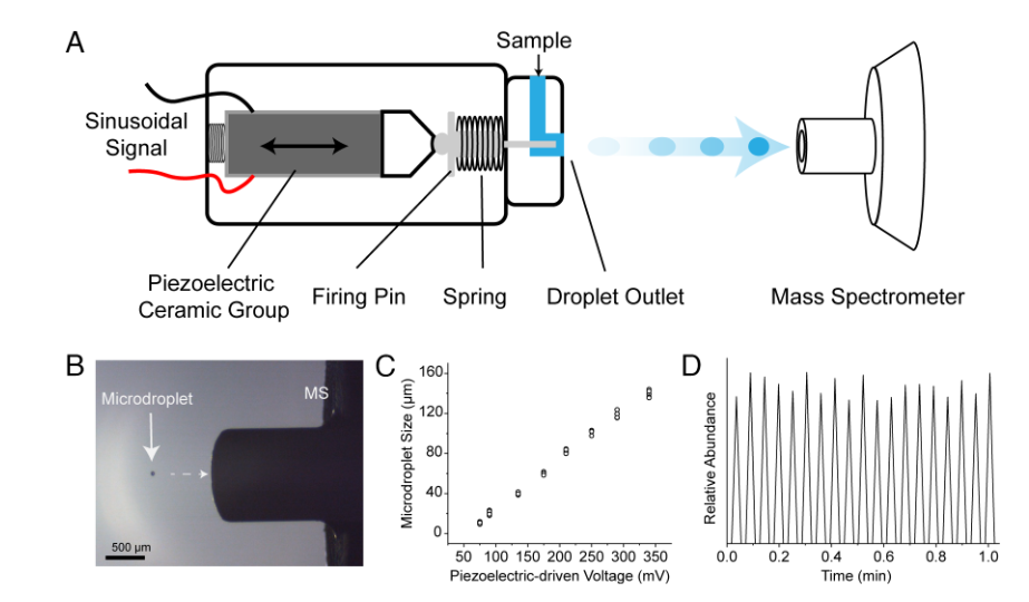 研究团队首先构建了一套压电按需液滴生成系统,该系统可产生直径在5至150微米范围内精确控制的单个水性微滴,并将其直接送入质谱仪进样口。高速成像证实液滴在飞行过程中未与质谱毛细管接触,排除了外部激发干扰,确保了观测到的反应活性完全源自微液滴自身环境。