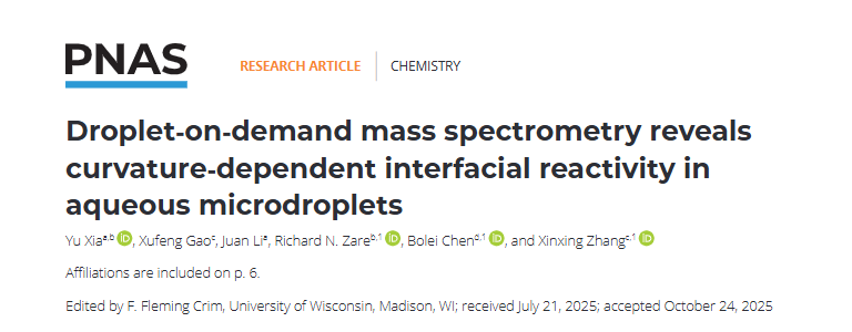 Yu Xia , Xufeng Gao , Juan Li , Richard N. Zare , Bolei Chen , Xinxing Zhang. Droplet-on- demand mass spectrometry revealscurvature-dependent interfacial reactivity inaqueous microdroplets. Proceedings of the National Academy of Sciences of the United States of America. DOI: 10.1073/pnas.2519491122