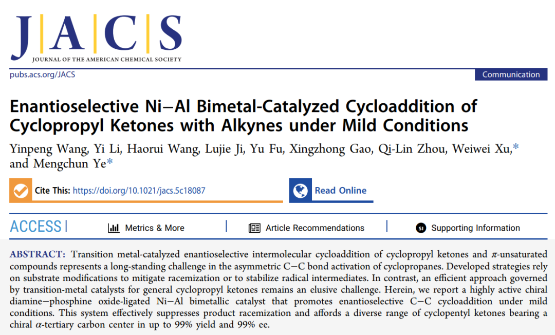 Yinpeng Wang, Yi Li, Haorui Wang, Lujie Ji, Yu Fu, Xingzhong Gao, Qi-Lin Zhou, Weiwei Xu, Mengchun Ye. Enantioselective Ni-Al Bimetal-Catalyzed Cycloaddition of Cyclopropyl Ketones with Alkynes under Mild Conditions. Journal of the American Chemical Society. DOI: 10.1021/jacs.5c18087
