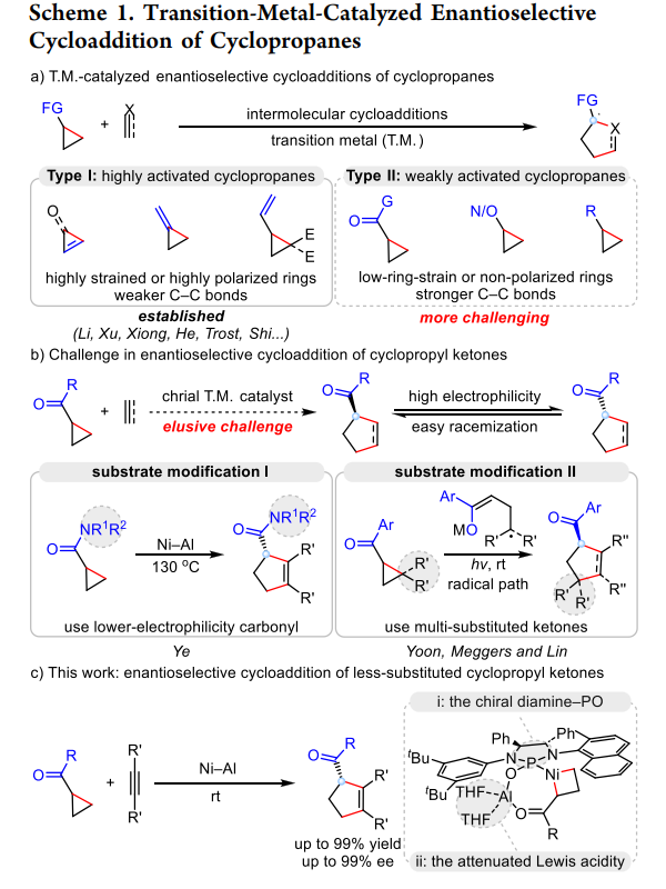 过渡金属催化的环丙烷与π-不饱和化合物的对映选择性环加成反应是构建手性环戊烷和环戊烯等环状结构的高效策略,在药物化学领域具有广泛应用。然而,环丙烷的高C-C键能使其活化面临巨大挑战,现有的对映选择性环加成反应主要局限于需要多步底物合成的分子内过程。对于环丙基酮这类弱活化环丙烷,由于酮羰基的亲电性容易在高温或路易斯酸催化下导致手性α-叔碳中心的外消旋化,实现高对映选择性的分子间环加成一直是个长期挑战。虽然已有研究通过底物修饰或光催化策略取得进展,但开发适用于普通环丙基酮的高效催化体系仍是一个难题。