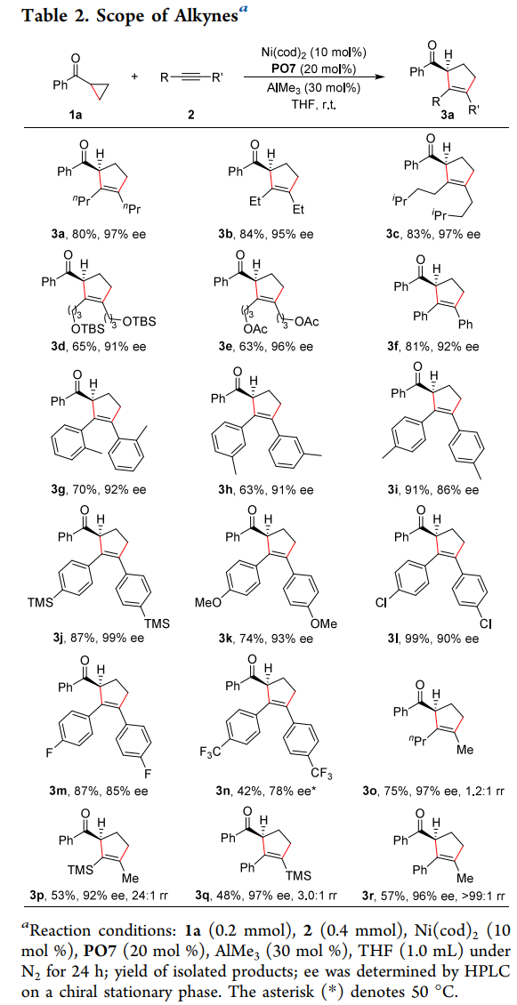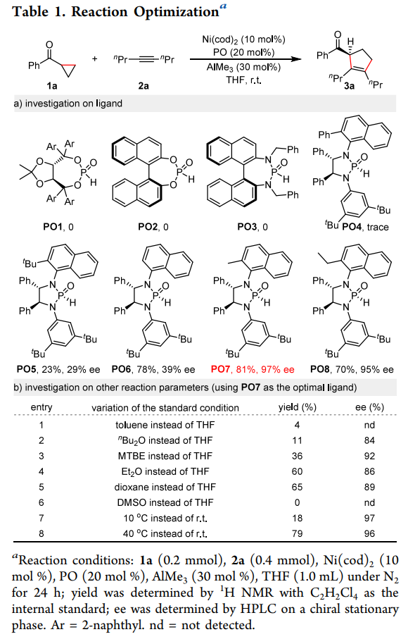 以环丙基酮1a和4-辛炔2a为模型底物,作者系统筛选了手性配体和反应条件。研究发现TADDOL衍生的配体PO1完全无效,而手性二胺基配体PO4能成功促进环加成反应。配体骨架的立体效应研究表明,N-萘基位阻对反应性能具有关键影响:叔丁基取代的PO5仅获得23%收率,未取代萘基的PO6提高至78%收率但对映选择性较低,甲基取代的PO7被确定为最优配体,在THF溶剂中室温反应24小时,以81%收率和97% ee获得产物3a。溶剂筛选表明中等配位性的醚类溶剂表现优异,而弱配位非极性溶剂或强配位极性溶剂均会抑制反应。温度实验显示升高温度会损害对映选择性,降低温度则减少化学收率。