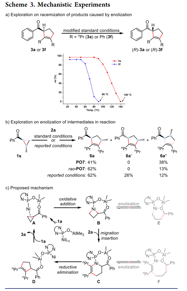 机理研究表明,手性产物3a和3f在室温下具有优异的立体化学稳定性,但加热会导致逐步外消旋化,证实高温是导致外消旋化的关键因素。当将手性环丙基酮1s置于标准催化体系中时,无论使用手性或外消旋PO配体,仅检测到构型保持的产物6a和6a",这与先前报道中显著形成构型反转产物6a'的结果形成鲜明对比。这表明当前Ni-PO-Al催化体系在环境条件下有效抑制了烯醇化介导的表异构化。作者提出合理机理:1a与Ni-PO-Al催化剂配位形成中间体A,经氧化加成得到镍杂环丁烷B,炔烃2a插入C-Ni键生成镍杂环己烯C,最后经还原消除得到中间体D,解离释放最终产物3a并再生催化剂。