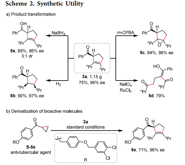 克级规模反应以75%收率和96% ee获得3a,证明了该方法的实用性。产物3a可进行多样化衍生化:NaBH₄还原得到醇5a(89%, 96% ee);氢化反应得到酮5b(90%, 97% ee);m-CPBA或NaIO₄/RuCl₃氧化分别得到环氧化物5c(84%, 96% ee)或二酮5d(79%)。该方法还能实现生物活性分子S-5e的后期多样化,以71%收率和96% ee获得手性衍生物5e,展示了其在复杂环丙基酮 scaffold修饰中的潜力。