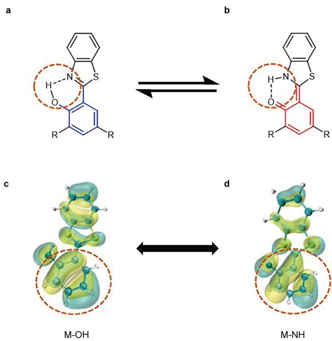 图1 分子设计。氢迁移前后的化学结构(a)和(b)。c、d 氢迁移前(M-OH)后(M-NH)的HOMO分布。