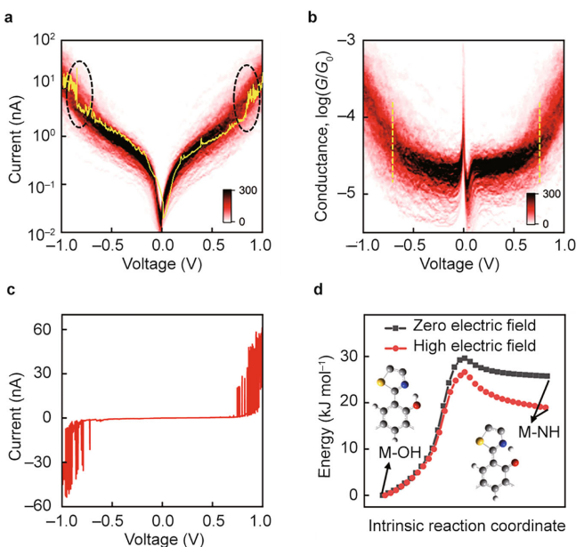 研究团队进一步探索了外加电场对氢原子状态的影响。通过在悬停静止状态下记录单分子结的电流-电压(I-V)演化,发现在数百条I-V曲线中,约50%表现出显著的电流跳变 。 典型的I-V轨迹(图4a中的黄色曲线)和对应的二维电导-电压(G-V)直方图(图4b)显示,分子电导在低电压下变化微小,但当电压超过约0.75 V的临界阈值时,会发生突然的跃迁 。这表明高电场能够稳定M-NH构型,促使分子在高偏压下更倾向于捕获M-NH态 。