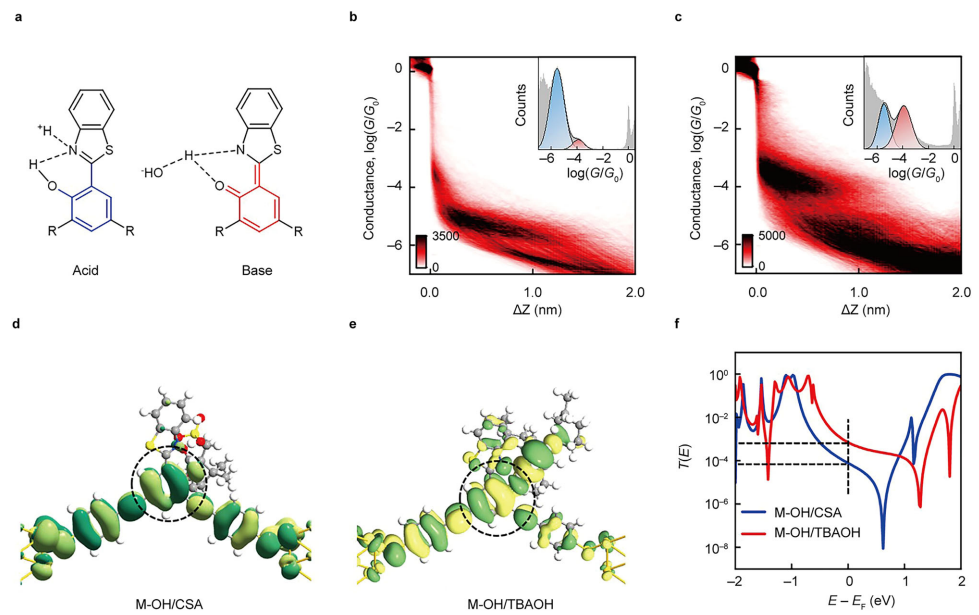 研究进一步还展示了化学环境对分子电子结构的精确控制。团队分别引入樟脑磺酸(CSA)作为H⁺源和四丁基氢氧化铵(TBAOH)作为OH⁻源,以调节溶液的酸碱环境(图5a)。实验发现,酸性环境会破坏分子内的氢键相互作用,阻碍N与H的结合,从而锁定分子在低电导的M-OH态;反之,碱性环境则有助于稳定高电导的M-NH态。二维电导直方图(图5b, c)直观地记录了加入酸碱后电导分布的显著变化 。这种基于酸碱反应的单原子级空间位移调控,实现了对分子电子结构的可逆、可控调节,为开发环境响应型分子传感器提供了直接的实验依据。