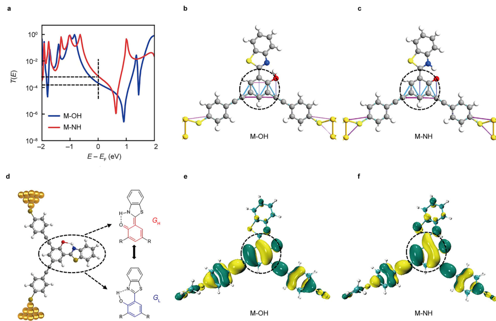 图3 单个氢原子对芳香体系电子结构的调控机制。a氢迁移前(蓝色)和迁移后(红色)的理论透射谱。b、c分别为氢迁移前后的理论电子传输路径示意图。d M-OH中氢迁移互变异构的示意图。e、f分别呈现了氢迁移前(M-OH)和迁移后(M-NH)的HOMO分布。