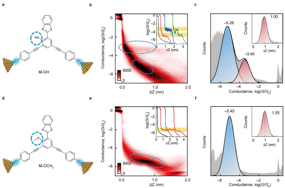 团队通过STM-BJ技术构建了金-分子-金单分子结(图2a、d),在0.1V偏压下采集数千条电导-位移曲线,构建二维直方图(图2b、e)。M-OH分子表现出两个明显的电导平台:高电导态(GH≈0.35×10⁻³ G0)和低电导态(GL≈0.55×10⁻⁵ G0)(图2c)。而对照分子M-OCH3仅显示单一低电导平台(≈0.35×10⁻⁵ G0),与M-OH的GL态相似。单条轨迹显示GH与GL态可随机转换(图2b、e插图),表明二者处于动态平衡。平台长度统计表明两种状态下的分子结长度均为≈1.50 nm,与分子长度一致(图2c插图),证实GH与GL态源于同一分子的