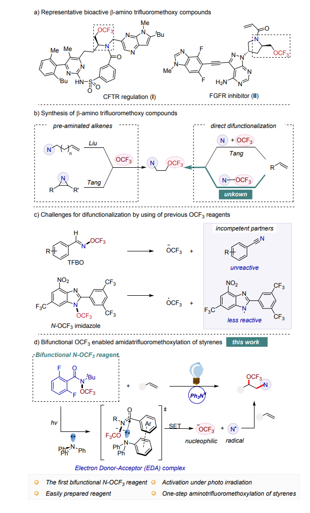 本研究首次开发了双功能N-OCF₃试剂,通过EDA复合物光活化实现了苯乙烯的高效氨基三氟甲氧基化。该方法条件温和、底物适用范围广,并成功用于生物活性分子的后期修饰,为含OCF₃药物分子的合成提供了新策略。