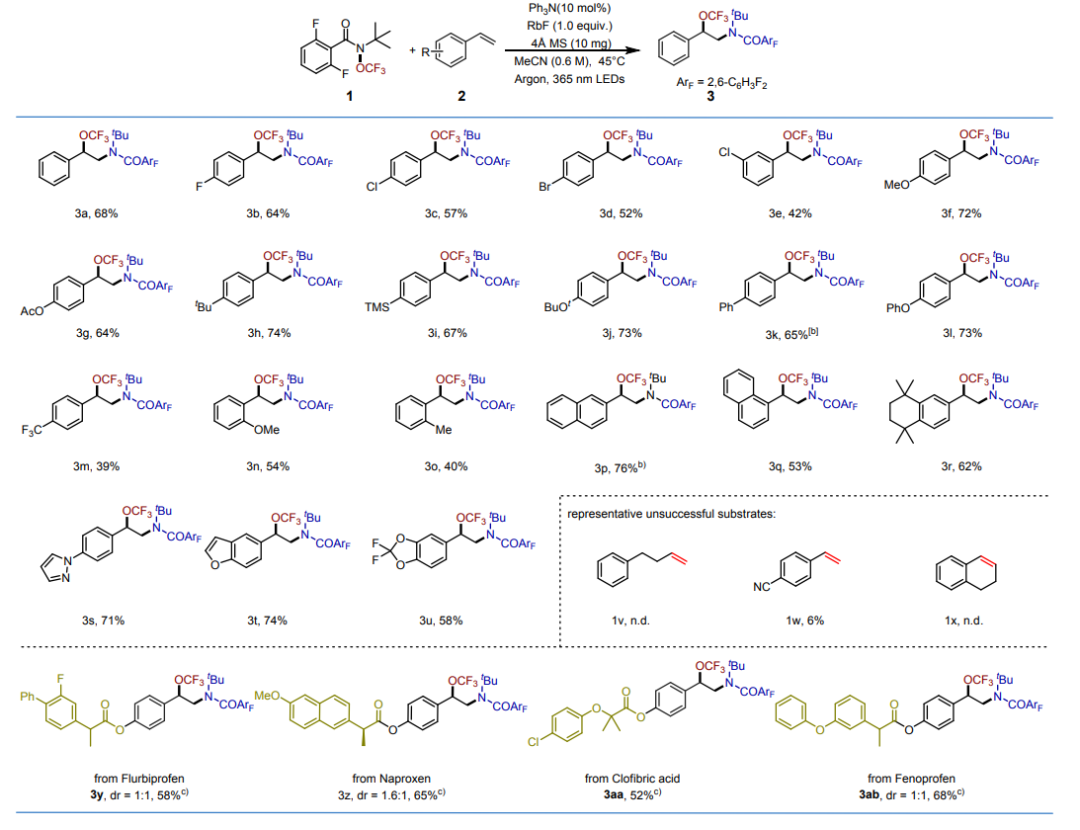 该策略在复杂生物活性分子修饰中表现出突出价值。例如,对含有药物核心结构的烯烃底物进行官能化,以中等至良好收率获得目标产物(3y-3ab),证明了其在药物发现中简化β-氨基-OCF₃骨架构建的实用性。