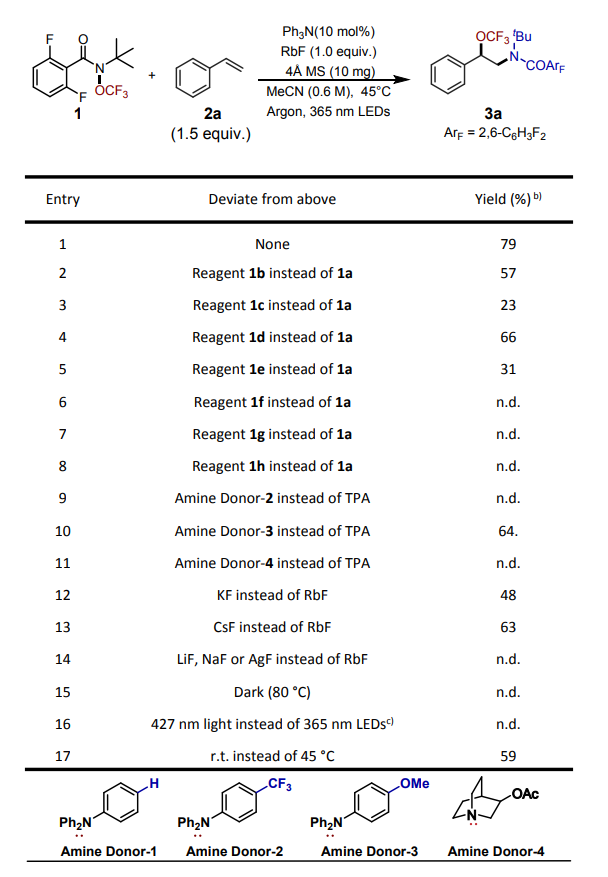 以苯乙烯(2a)为模型底物,系统评估了N-OCF₃试剂(1a-1h)的结构与反应条件。最优条件为:以1a为试剂,乙腈为溶剂,三苯胺(TPA)为电子给体,RbF为氟源,在365nm光照和45°C下反应,可获得79%的NMR收率。苯甲酰基取代基的电子效应和空间位阻显著影响反应效率,而N-烷基取代基(如Me、Bn)会因竞争性1,2-氢原子转移或氮自由基活性降低导致反应失败。此外,缺电子胺类无法形成EDA复合物,且RbF可通过抑制OCF₃⁻分解(OCF₃⁻⇌COF₂+F⁻)提高反应效率。