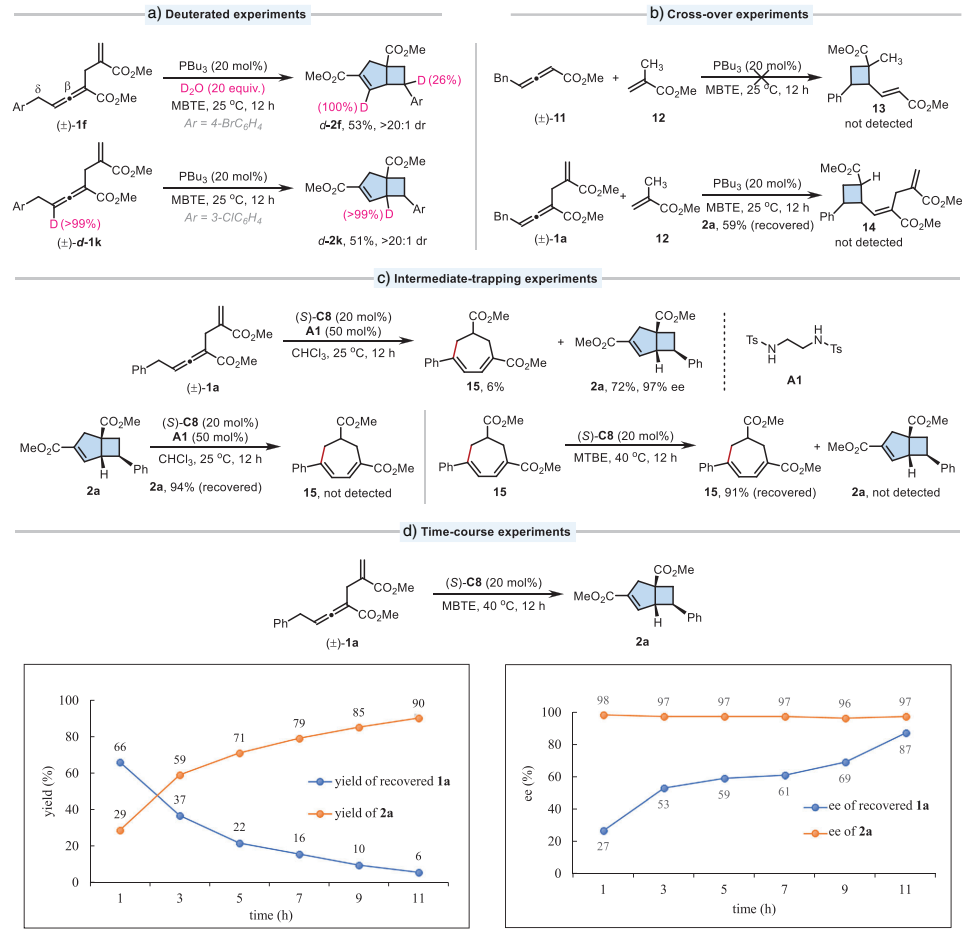 氘代实验表明反应中形成了碳负离子中间体。交叉实验证实了反应遵循分子内历程。中间体捕获实验成功分离到亲核加成产物15,支持七元环中间体的存在。时间进程实验显示产物ee值始终保持高位(96-98%),而回收底物的ee值逐渐增加至87%,表明存在动态动力学拆分过程。