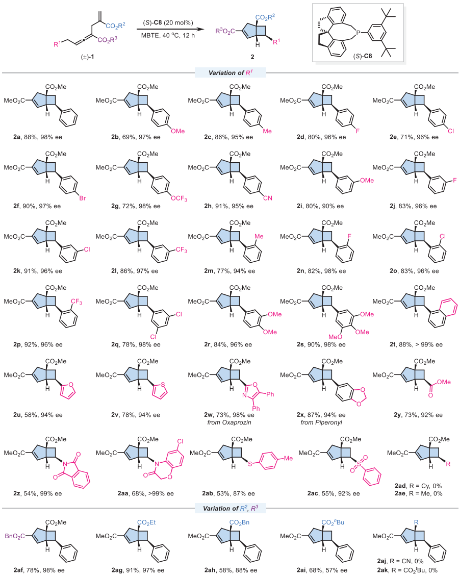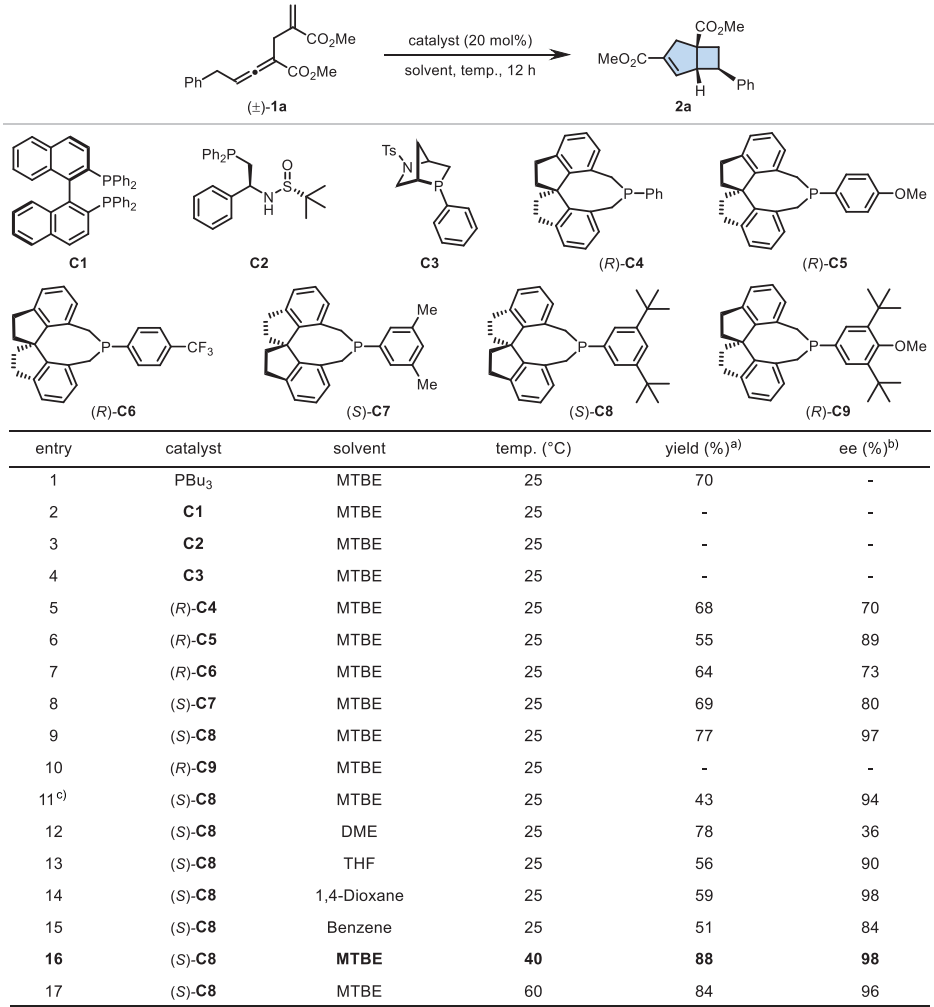以α-烯丙基γ-苄基联烯酸酯1a为模型底物进行条件优化。初步实验表明,PBu3在室温下能以70%收率得到外消旋产物2a。随后筛选多种手性膦催化剂发现,螺环膦催化剂C4能获得68%收率和70% ee。进一步优化显示,含有3,5-二叔丁基苯基的催化剂C8效果最佳,在40°C下能以88%收率和98% ee获得产物2a。