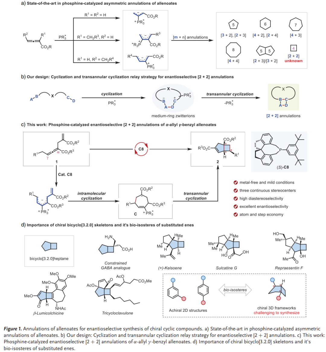 稠合环丁烷骨架是天然产物和药物分子中的重要结构单元,但由于环张力及立体控制等挑战,其催化不对称合成方法仍十分有限。自1995年陆熙炎课题组开创性工作以来,膦催化的联烯酸酯环化反应已成为构建手性环状化合物的重要策略。联烯酸酯可作为C2、C3、C4和C6合成子参与多种环化反应,但迄今为止主要局限于构建普通或中等尺寸环系。近年来,中环化合物的跨环环化策略为构建复杂小环体系提供了新思路。