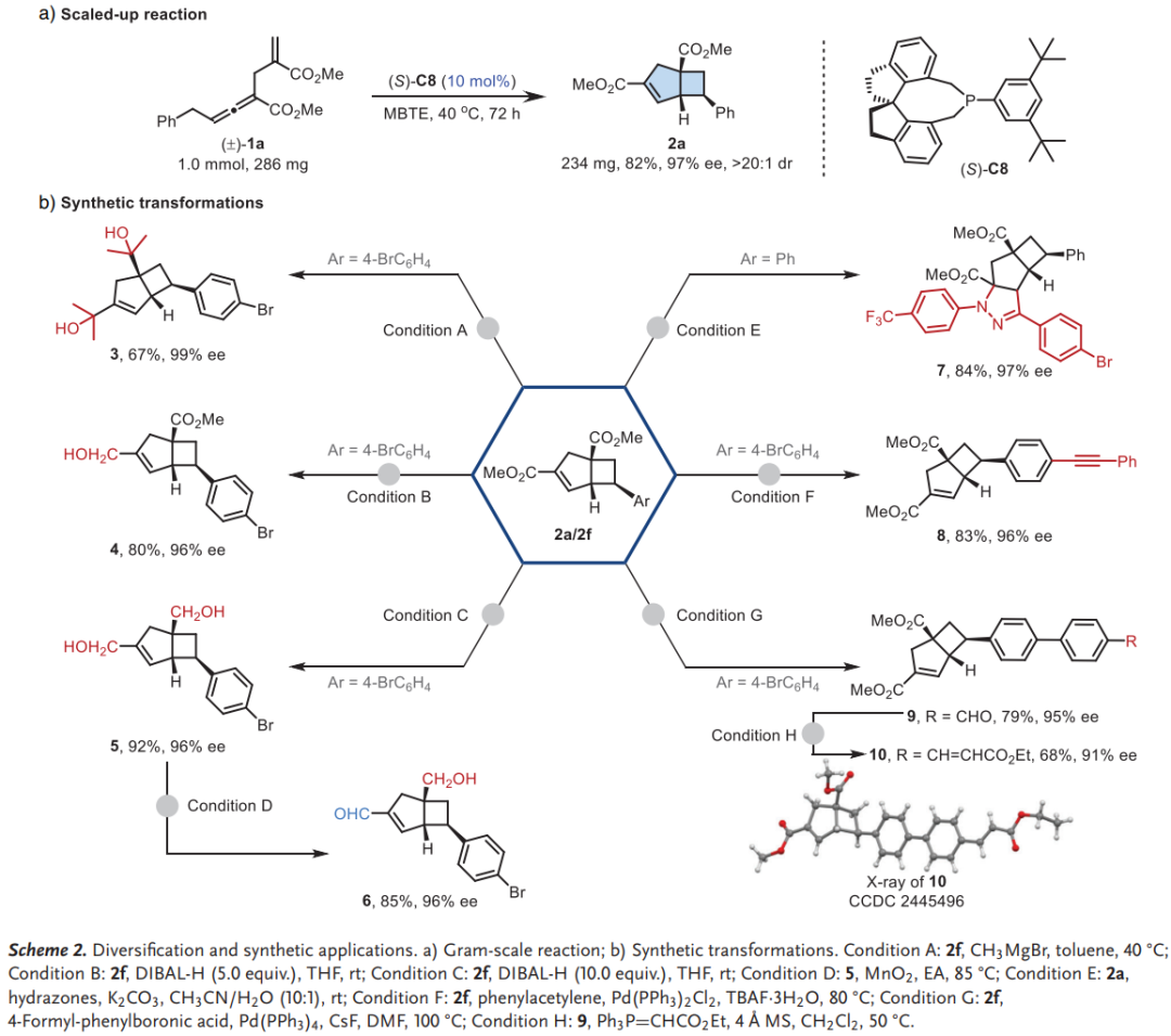 克级规模实验证实了该方法的实用性,1.0 mmol规模反应仍能以82%收率和97% ee获得产物。产物可进行多样化衍生化,包括格氏试剂加成、DIBAL-H还原、[3+2]环加成以及Sonogashira和Suzuki偶联等反应,且对映纯度在整个转化过程中得以保持。通过X射线衍射分析确定了产物10的绝对构型,为其他产物的立体化学归属提供了依据。