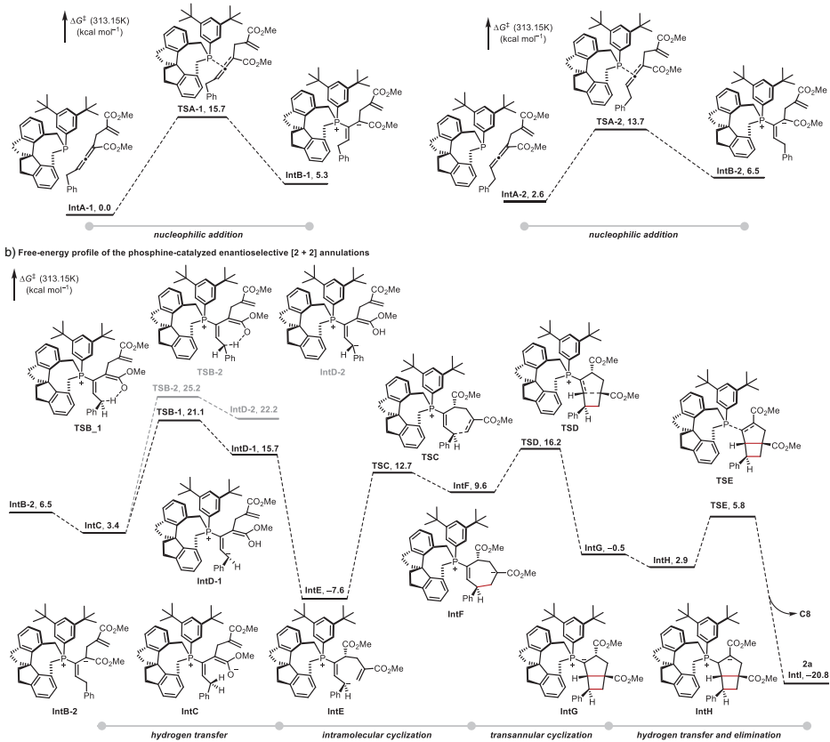 DFT计算揭示了详细反应机理:手性膦催化剂对联烯酸酯的亲核加成是可逆步骤,实现动态动力学拆分;δ-位碳的分子内氢转移去质子化是速率和对映选择性决定步骤;随后经历迈克尔加成形成七元环中间体,最后通过跨环环化生成最终产物。