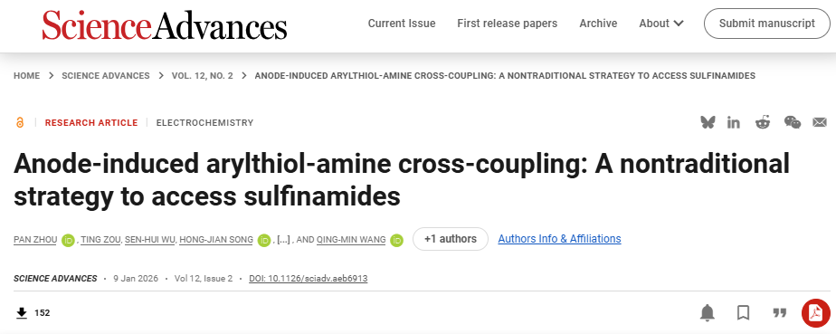 Pan Zhou, Ting Zou, Sen-hui Wu, Hong-jian Song, Yu-xiu Liu, Qing-min Wang*. Anode-induced arylthiol-amine cross-coupling: a nontraditional strategy to access sulfinamides. Sci. Adv., 2025, http://doi.org/10.1126/sciadv.aeb6913.