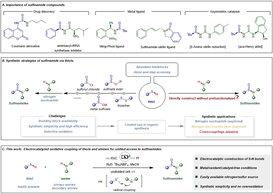 图1. 电氧化策略突破亚磺酰胺合成中的非自由基限制