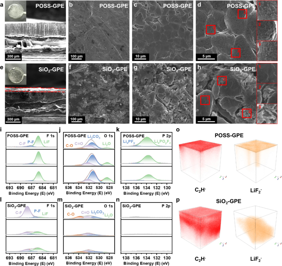 图2 循环后Li电极的SEI表征。采用(a-d) POSS-GPE和(e-h) SiO₂-GPE的Li∥Li对称电池在0.1 mA cm⁻²和0.1 mAh cm⁻²、25°C条件下循环50次后Li的SEM图像(公众号Gaussian)。采用(i-k) POSS-GPE和(l-n) SiO₂-GPE的Li∥Li对称电池在相同条件下循环50次后Li的(i, l) F1s、(j, m) O1s和(k, n) P2p XPS谱图。采用(o) POSS-GPE和(p) SiO₂-GPE的Li∥Li对称电池在相同条件下循环50次后Li上C₂H⁻和LiF₂⁻碎片的ToF-SIMS三维分布图。