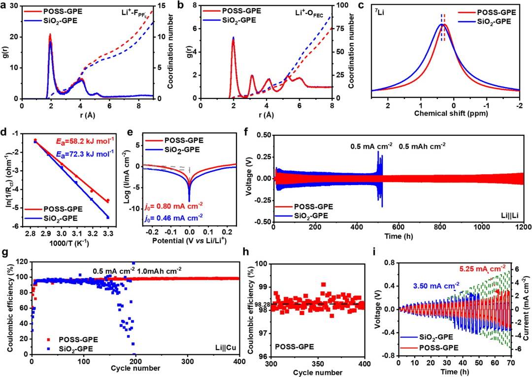 图1 (a-b) SiO₂-GPE和POSS-GPE中Li⁺-FPF₆和Li⁺-OFEC的径向分布函数与配位数计算结果。(c) SiO₂-GPE和POSS-GPE的⁷Li NMR谱图。(d) 基于EIS数据通过Arrhenius拟合得到的去溶剂化活化能(Ea)。(e) Li∥Li对称电池的Tafel曲线(公众号Gaussian)。(f) 采用不同GPE的Li∥Li对称电池在0.5 mA cm⁻²和0.5 mAh cm⁻²条件下的循环稳定性。(g-h) 采用不同GPE的Li∥Cu电池在0.5 mA cm⁻²和1 mAh cm⁻²条件下的库仑效率(CE)。(i) 采用不同GPE的Li∥Li对称电池的临界电流密度(CCD)。