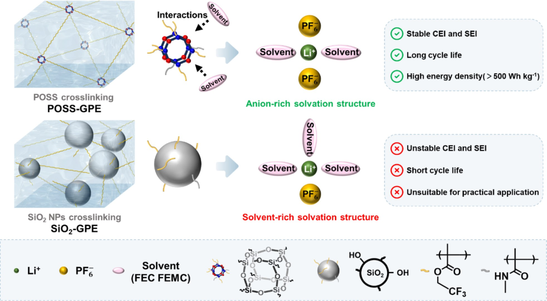 示意图1. POSS-GPE与SiO₂-GPE在高压LMBs中溶剂化结构调控机制对比示意图。