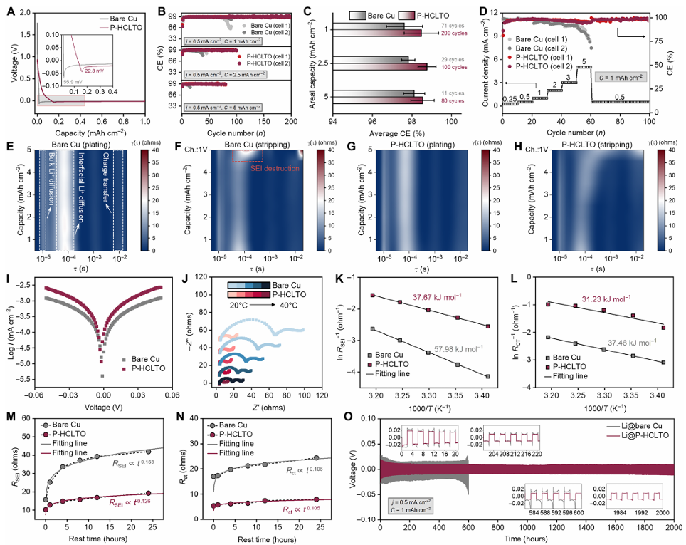 图6. 锂电镀/剥离的长期稳定性与动力学对比。(A-H) 使用裸铜和P-HCLTO的Li||Cu半电池的电化学评估(包括过电位、库伦效率、倍率性能、DRT分析)。(I-O) 使用Li@裸铜和Li@P-HCLTO的Li||Li对称电池的电化学评估(包括交换电流密度、EIS、活化能、界面阻抗演化、长循环稳定性)。