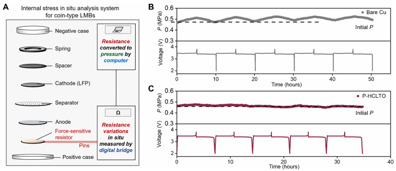 图8. 用于扣式LMBs中锂电镀/剥离的原位内部应力监测(A) 用于扣式LMB配置的内部应力分析系统示意图。(B, C) 使用裸铜和P-HCLTO的AFLMBs的恒电流充放电曲线及相应的内部应力演变。