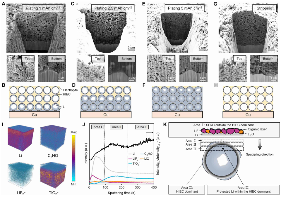 解析:此图深入揭示了“内部工作机制”。FIB-SEM断层扫描(A-H)清晰显示了锂优先在靠近集流体的纳米腔内成核,然后顺序填充,最终实现完全封装,剥离过程高度可逆。TOF-SIMS(I-K)从化学角度证明,在HIEC表面形成了外层有机、内层富无机(如LiF)的梯度SEI,而封装在内部的锂得到了有效保护,几乎不与电解液接触。