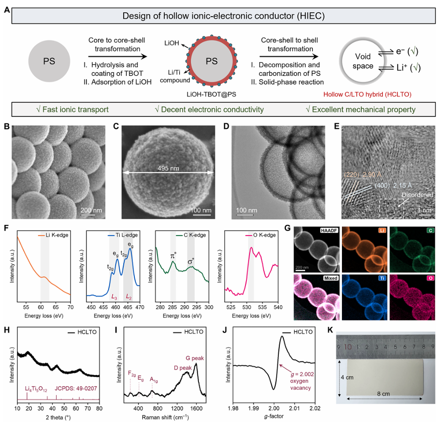 解析:此图回答了“材料是什么”和“如何制备”。它证实了成功合成了具有空心纳米腔、LTO/碳梯度复合(离子/电子混合导体)以及富含氧空位的关键结构特征。图K展示了其具备可扩展加工的潜力。