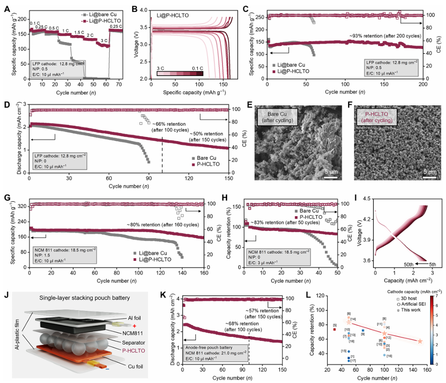 解析:此图验证了“全电池性能与实用性”。无论是搭配商业化LFP还是高能量密度NCM811正极,在贫电解液、有限锂源等苛刻条件下,采用P-HCLTO的电池均展现出远优于裸铜的循环稳定性。特别是软包电池(J-L)的成功演示,以及与同类研究相比的优异性能(L),强有力地证明了该技术的实际应用潜力。