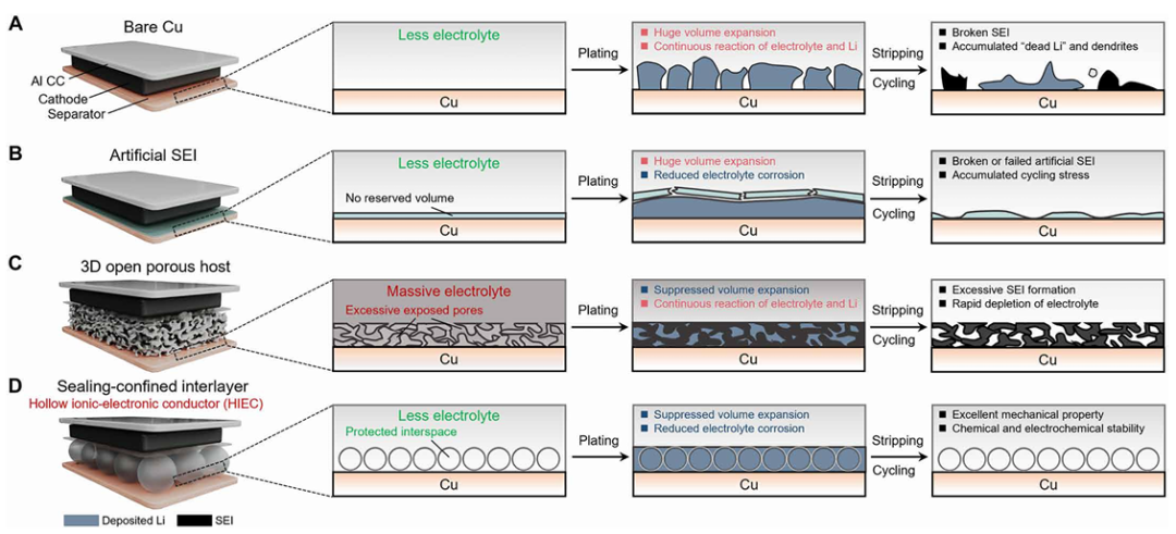 图1. 不同夹层配置的无负极锂金属电池结构示意图。(A) 使用裸铜作为负极的传统AFLMB。(B) 使用人工SEI修饰集流体的AFLMB:缓解了电解液对锂沉积的腐蚀,但在循环中缺乏体积适应性。(C) 使用3D开放多孔宿主的AFLMB:抑制了锂沉积膨胀,但因过度形成SEI而加速了电解液消耗。(D) 使用HIEC修饰集流体的AFLMB:作为一个密封限域的夹层,兼具保形SEI和3D宿主的双功能协同配置。背景色深度代表电解液用量,其中3D多孔宿主颜色最深是因为其开放孔隙需要比正常条件更多的电解液浸润。