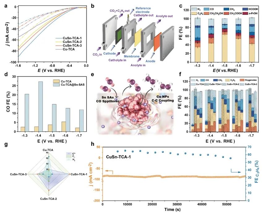 随后,对该催化剂体系的ECO2RR性能进行了探究。结果表明,CuSn-TCA-1表现出最优的C2H4生产选择性。在-1.5 V vs. RHE电位下,其C2H4法拉第效率(FE)高达64%,对全部C2+产物的总FE达到77%。13C同位素标记实验验证了产物完全来源于CO2。为阐明催化机制,作者进行了系统的控制实验。当使用Cu-TCA@Sn-SAs(仅有Sn SAs)和Cu-TCA前体作为催化剂时,主要产物分别为CO2和H2。当在进气中提高CO比例时,FEC2H4随之提升,为高效的串联催化路径提供了直接证据。并且,进行了CuSn合金的对比实验其产物主要为CO,证实了MOF框架通过孔道限域稳定活性位点并限制CO溢出,从而实现串联催化的关键作用。