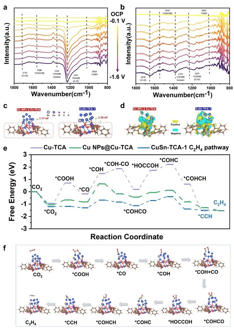 最后,作者采用原位ATR-FTIR和DFT计算进行了机理探究。在CuSn-TCA-1表面,随着电位负移,可清晰观察到*COOH(1237 cm-1, 1335 cm-1)及C-C耦合关键中间体*COCOH(1560 cm-1)的信号增强,而在Cu-TCA上这些信号非常微弱。DFT计算表明,Sn SAs的引入促进了电子从MOF骨架向Cu NPs的转移,形成缺电子的Cuδ+位点,这有助于稳定*CO中间体。Bader 电荷和差分电荷密度分析表明,Sn SAs的引入促进了电子从Cu NPs向MOF的转移(总转移量从1.17 eV提升至1.34 eV),Cu表面形成富电子位点,有利于稳定*CO中间体。自由能计算显示,CuSn-TCA-1的*COOH形成能垒最低,且显著降低了决速步*CO加氢至*COH的反应能垒。反应机制示意图清晰展示了 CO2在Sn SAs上生成CO,随后扩散至Cu NPs 表面发生C-C 耦合生成C2H4的路径。
