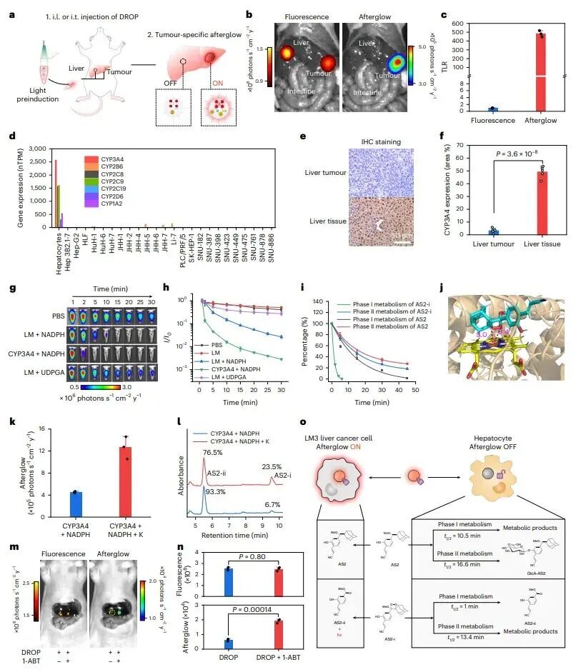 图中阐明了探针肿瘤特异性的分子基础:a-c部分通过局部注射实验证实,DROP在肿瘤组织中产生强余辉信号(SBR=758.6),在正常肝组织中信号微弱(SBR=1.57),肿瘤-肝脏比值(TLR)高达481.3;d-f部分通过数据库分析与免疫组化验证,正常肝细胞中CYP450酶(如CYP3A4)表达量是肿瘤细胞的13.6倍以上;g-l部分通过体外代谢实验证明,CYP450介导的I相代谢可快速降解探针中间体AS2-i(半衰期仅1分钟),而II相代谢作用微弱;m-o部分通过抑制剂实验(CYP3A4抑制剂酮康唑、广谱抑制剂1-ABT)进一步验证,CYP450酶的代谢作用是正常肝组织中探针余辉关闭的关键。