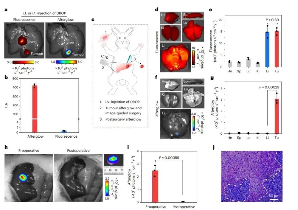 图中验证了DROP在小鼠模型中的应用价值:a-c部分显示,经静脉注射预诱导DROP后,6小时时肿瘤组织余辉TLR达260.1(SBR=370.9),远优于荧光成像(TLR≈1.5),且在1cm厚肝组织覆盖下仍保持高对比度成像;d-f部分证实,DROP在急性肝损伤、肝纤维化等病理模型中无明显余辉信号,仅在肿瘤组织中激活,具备良好的疾病特异性;g-j部分在PDX模型中,DROP可清晰勾勒1mm微小肿瘤边界,TLR高达274.7,引导手术实现肿瘤完整切除,术后残留余辉信号极低,经组织学验证无肿瘤残留。