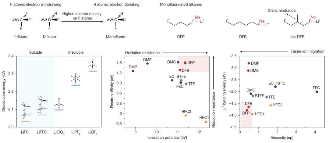 为此,南开大学团队设计合成了系列新型氟代烃溶剂分子,通过调控氟原子的电子密度和溶剂分子的空间位阻,实现电解液中锂盐的有效溶解,成功取代了传统的锂-氧配位方式。
