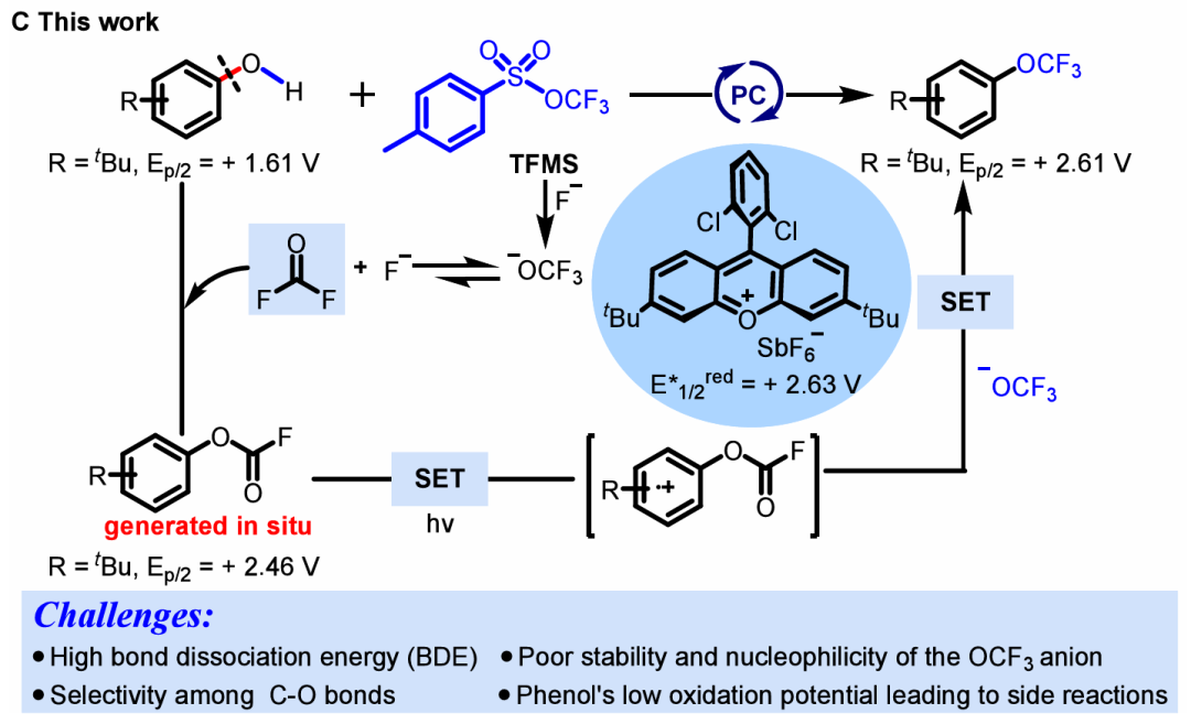 南开大学化学学院、有机新物质创造前沿科学中心汤平平教授、栾玉新副教授团队报道了光氧化还原催化的苯酚直接脱氧三氟甲氧基化反应。作者利用OCF₃⁻易分解生成二氟光气(COF₂)的特性,使其与苯酚原位反应生成氟代甲酸酯中间体,从而降低原本高达111 kcal/mol的Csp²–O键键能;随后通过高氧化电位有机光催化剂对该中间体进行单电子氧化,形成芳基阳离子自由基,在阳离子自由基加速的亲核芳香取代过程中引入OCF₃基团,实现选择性C–O键断裂与构建Ar–OCF₃键。该方法条件温和(蓝光、30–40 °C)、操作简便,对多种取代苯酚及杂环底物具有良好兼容性,可用于药物分子的后期修饰与克级放大反应。机理研究表明芳基氟代甲酸酯为关键中间体,反应经历单电子转移过程,OCF₃⁻对芳基阳离子自由基的进攻几乎无势垒,解释了优异的化学选择性。